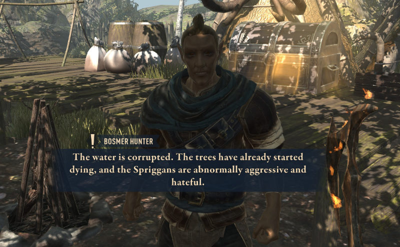 スプリガンを倒しながら奥へ進むとウッドエルフに遭遇した。彼らに話を聞くとこの辺りの水が汚染されてて、木々がすでに死に始めており、スプリガンが尋常になく攻撃的になってるらしい。レンジャー マラウェンのことを聞くと消えた住人を探すためにこの先の道を下っていったらしい。彼らから扉の鍵を受け取り、先に進む。