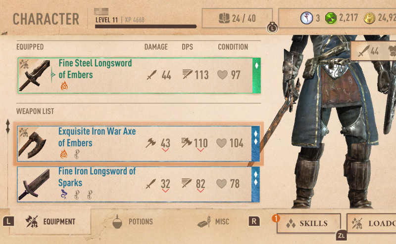 たとえば、鍛冶場のメニュー画面では【SHOP(店)】【CRAFT(製作)】【TEMPER(強化)】【REPAIR(修理)】と並んでいる。Android版では、タップしてそれぞれ即時に装備品の一覧が表示されていたけど、Switch版では一覧が表示されるまで少し間がある。まだ所持品が多くない現時点でこんな感じだと、所持品増えるともっともっさりするのかなと今から少し不安。