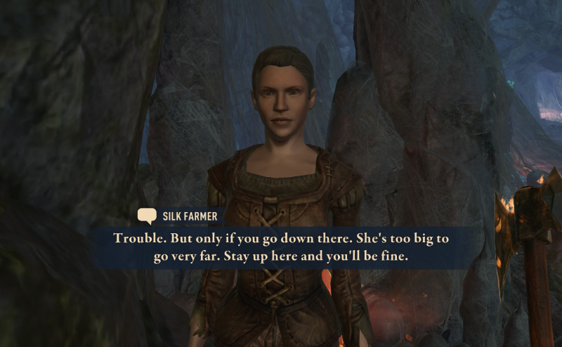 さらにその奥には、女性が閉じ込められていた。彼女いわく、女王クモはその巨体で遠くに移動できないから、ここにいれば大丈夫とのことだが。