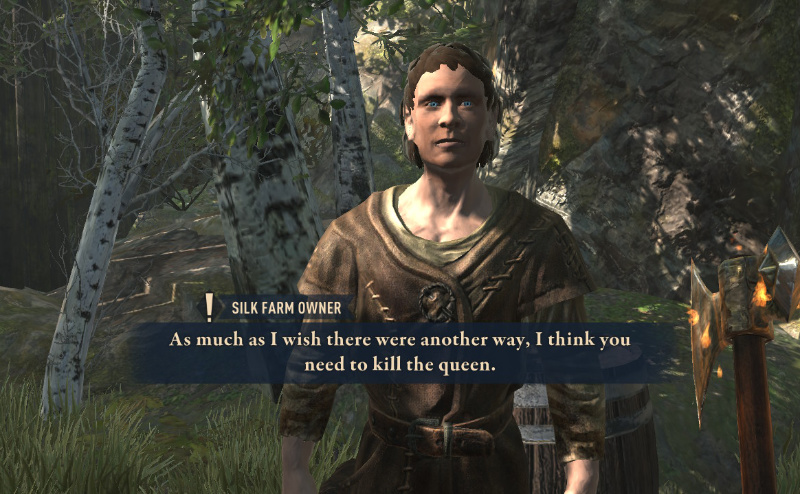 村中にいたクモをすべて始末し、卵を破壊してから戻ると、オーナーさん「女王始末するしかない、だって他に方法ないんだもん」ってことになった。疑惑は深まる一方。