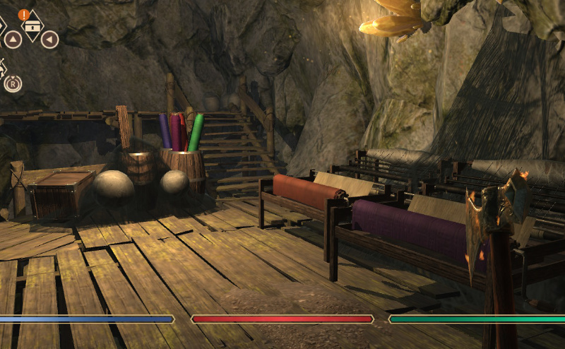 オーナーさんから鍵を受け取り、村の奥に進むと、洞窟があった。多数のクモが徘徊しているが、周りを見回してみると、織物っぽいのがある。普段はココで加工作業をしているのだろう。